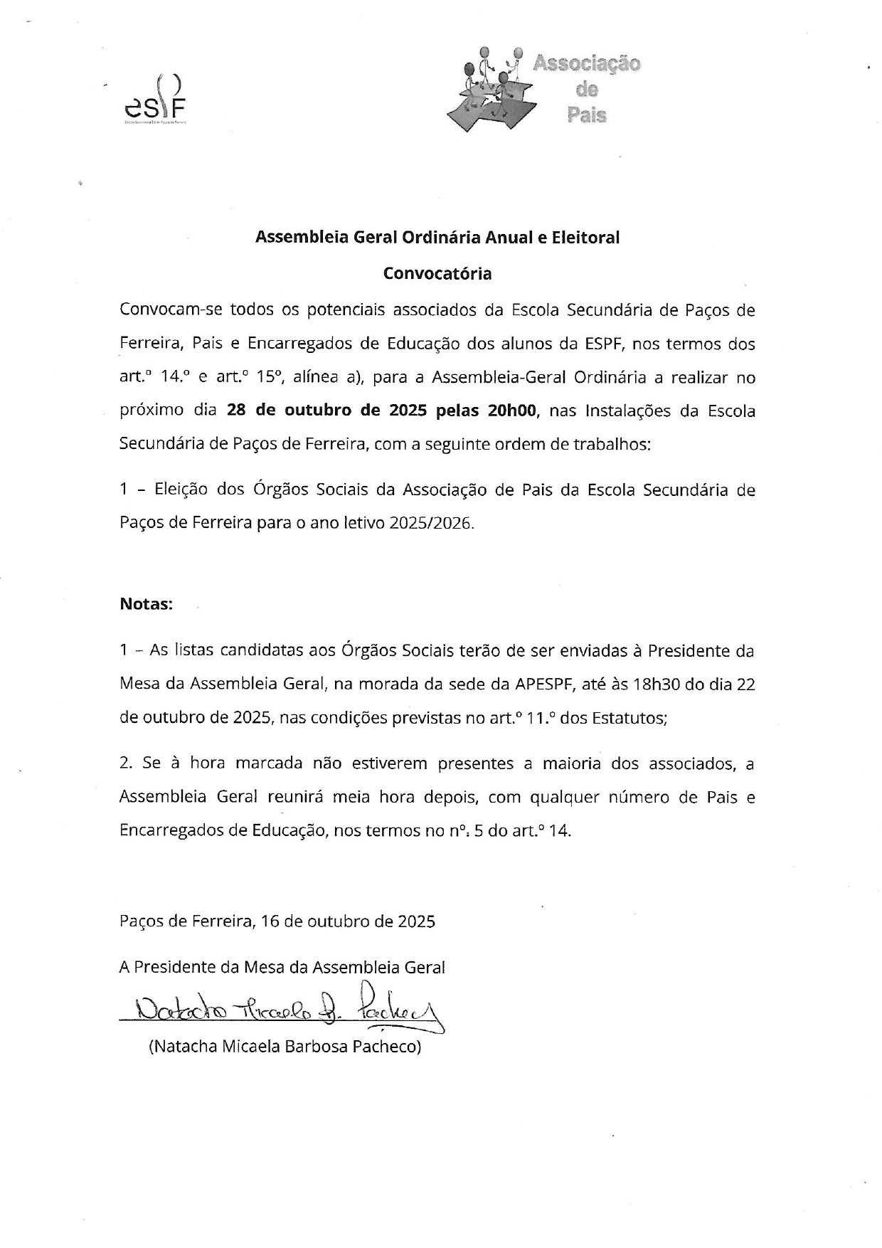 DestaqueNotíciasEncarregados de Educação Convocatória para Assembleia Geral Eleitoral da APESPF Data: 16 de Outubro, 2025 Partilhar: FacebookTwitterPinterestWhatsApp Divulgação da convocatória para Assembleia Geral Eleitoral da APESPF Ver convocatória | Download (JPG) Compartilhado FacebookTwitterPinterestWhatsApp - Oferta Formativa ━ populares Alunos Horário Desporto Escolar 6 de Outubro, 2025 0 Contratação de escola Contratação de Escola | Lista Ordenada [430 Economia e Contabilidade] | Horário n.º 9 3 de Outubro, 2025 0 Contratação de Escola | Lista Ordenada | Horário n.º 9 Ver lista | Download (PNG) Contratação de escola Contratação de Escola | Lista Ordenada [430 Economia e Contabilidade] | Horário n.º 10. 24 de Setembro, 2025 0 Contratação de Escola | Lista Ordenada | Horário n.º 10. Ver lista | Download (PDF) Contratação de escola Contratação de Escola | Lista Ordenada [430 Economia e Contabilidade] | Horário n.º 22 23 de Setembro, 2025 0 Contratação de Escola | Lista Ordenada | Horário n.º 22. Ver lista | Download (PDF) Destaque Eleição da Presidente do Conselho Geral 18 de Setembro, 2025 0 Eleição da Presidente do Conselho Geral Torna-se público que, em sede de Conselho Geral, reunido em 17 de setembro de 2025, se procedeu à eleição,... Contratação de escola Contratação de Escola | Lista Ordenada [530 Educação Tecnológica] | Horário n.º 14 15 de Setembro, 2025 0 Contratação de Escola | Lista Ordenada | Horário n.º 14 Ver lista | Download (PDF) Notícia anteriorHorário Desporto Escolar